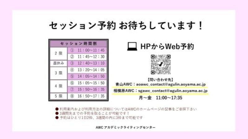 開室時間 青山キャンパス18号館(マクレイ記念館) 2階 2025年9月22日~2026年1月30日月曜日から金曜日11時から17時35分まで WEB予約はこちら 〇:空きがあります △:もう少しで埋まります ×:空きがありません 相模原キャンパス 万代記念図書館 2階 2025年9月22日~2026年1月30日月曜日から金曜日11時から17時35分まで WEB予約はこちら 〇:空きがあります △:もう少しで埋まります ×:空きがありません
