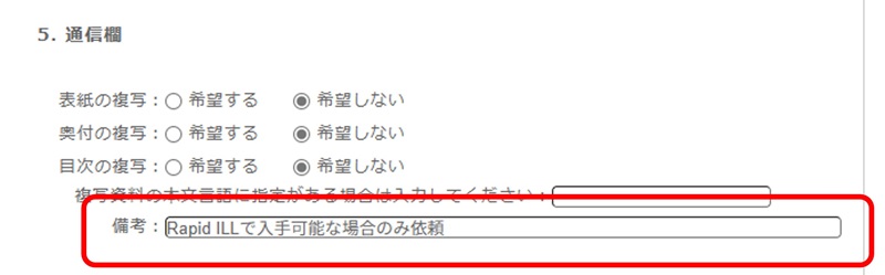 - Rapid ILLで入手不可の時、依頼を取りやめる場合は、必ず、「ILL複写依頼」申込画面の「備考」欄に「Rapid ILLで入手可能な場合のみ依頼する」とご入力ください。この記載がなく、Rapid ILLで入手不可となった場合は、事前に通告なく、通常のILL複写依頼処理(有料)に移行しますので、費用が発生します。一度、通常のILL複写依頼処理(有料)に移行した後、依頼を取り下げることはできません。